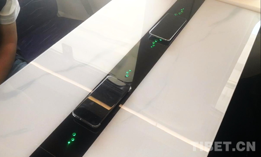 圖為乘客在三樂(lè)旅游鐵路列車(chē)上體驗(yàn)手機(jī)無(wú)線充電 攝影:劉莉