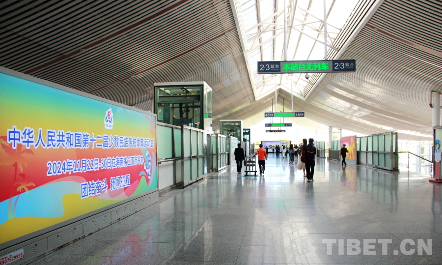 圖為海南三亞火車(chē)站門(mén)前第十二屆全國(guó)少數(shù)民族傳統(tǒng)體育運(yùn)動(dòng)會(huì)標(biāo)識(shí) 攝影:劉莉