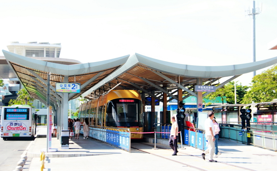 圖為海南三亞火車(chē)站外的公交車(chē)、有軌電車(chē)站 攝影:劉莉