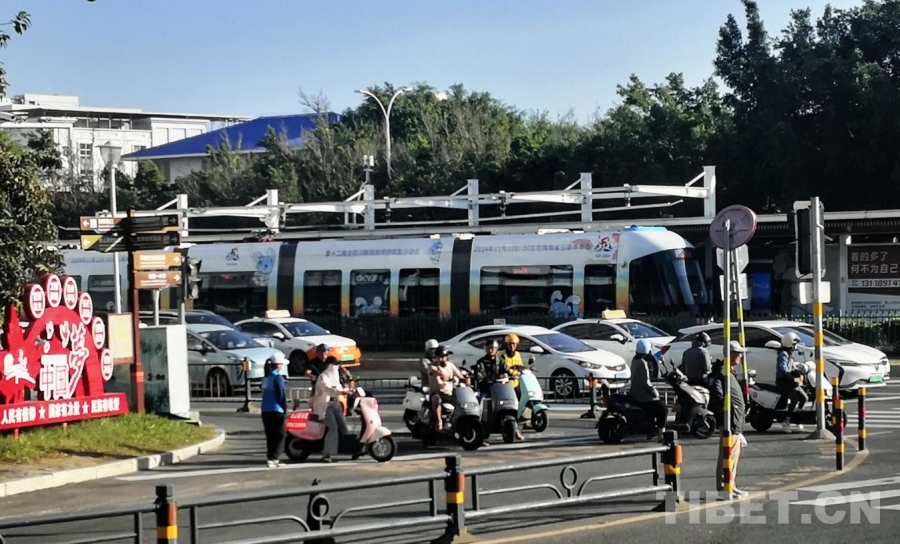 圖為涂裝第十二屆全國(guó)少數(shù)民族傳統(tǒng)體育運(yùn)動(dòng)會(huì)標(biāo)識(shí)的有軌電車(chē)駛過(guò)海南三亞街頭 攝影:劉莉