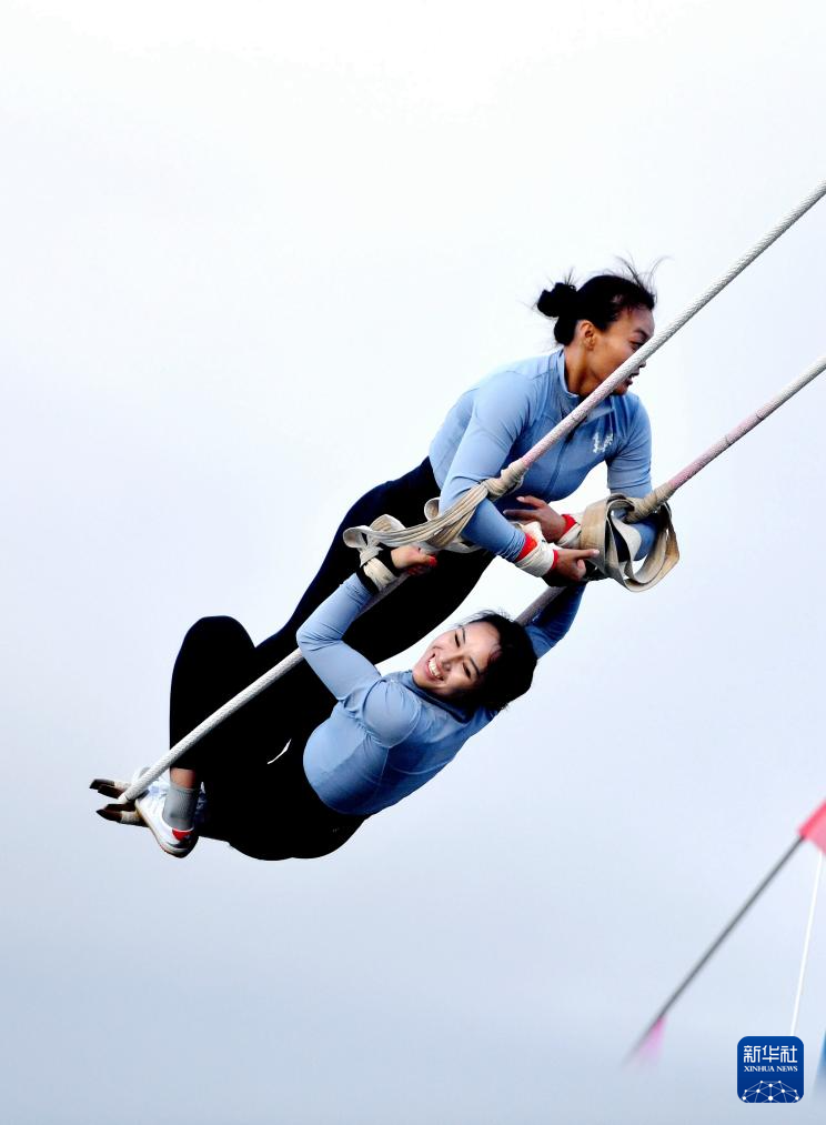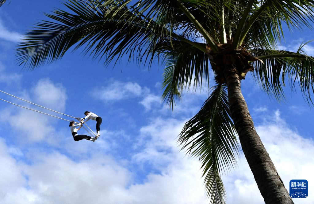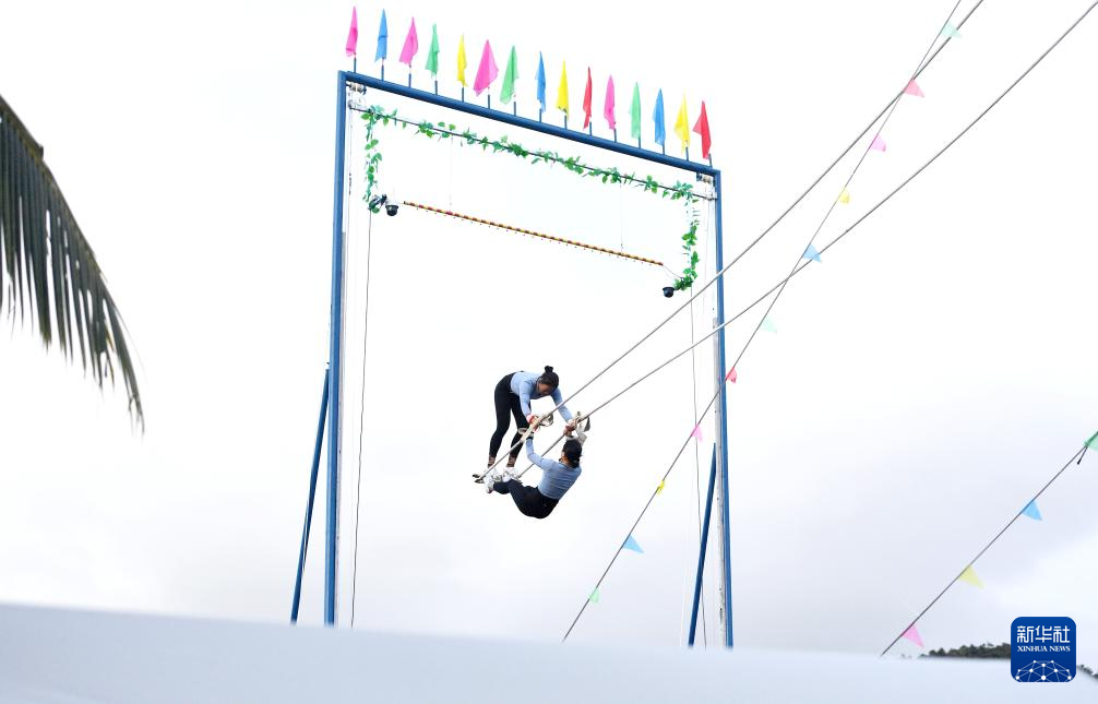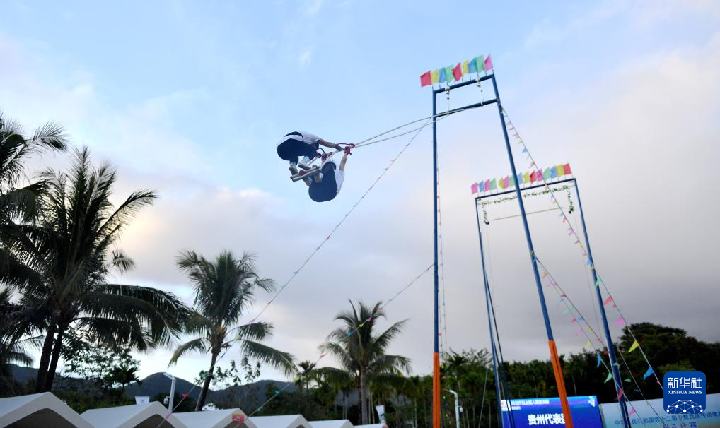 當(dāng)日,第十二屆全國少數(shù)民族傳統(tǒng)體育運動會秋千55公斤以上雙人高度決賽在海南三亞舉行。