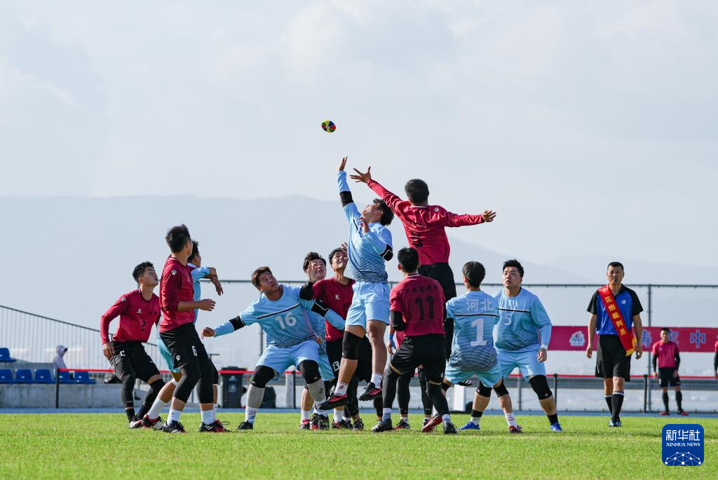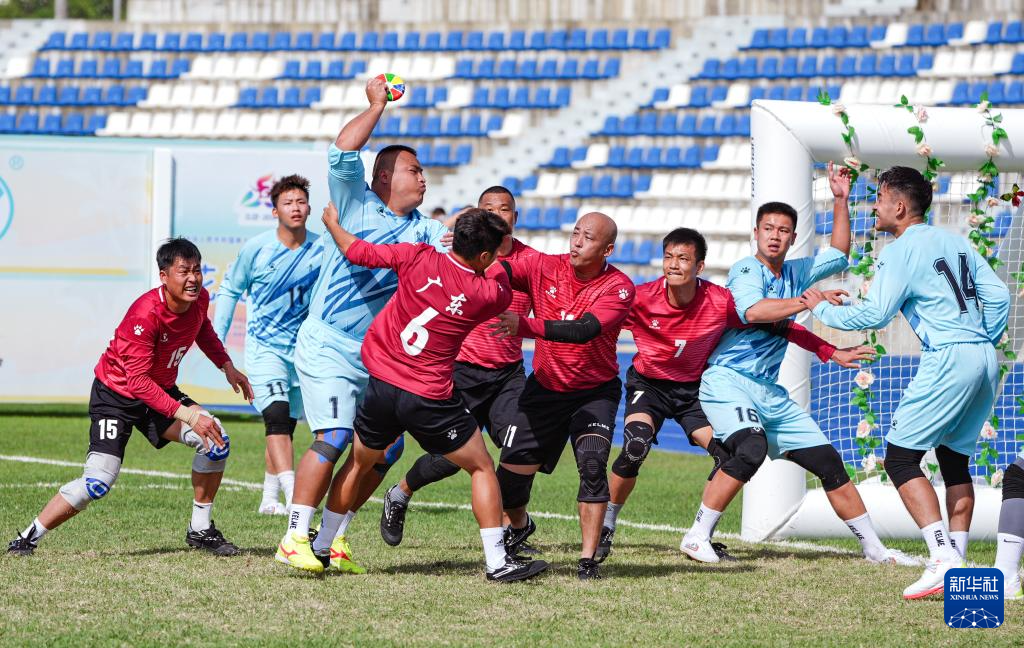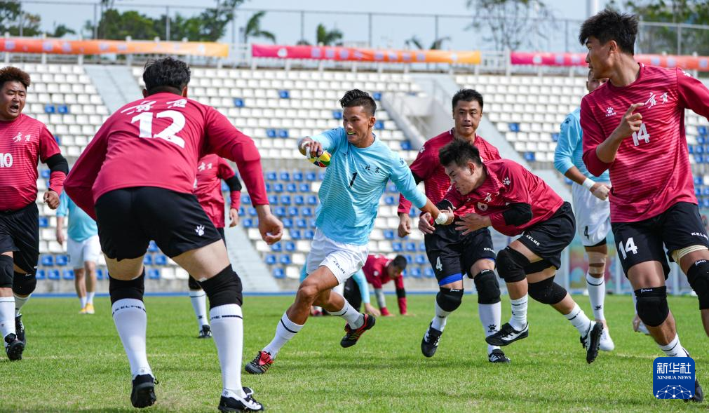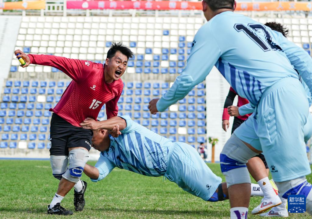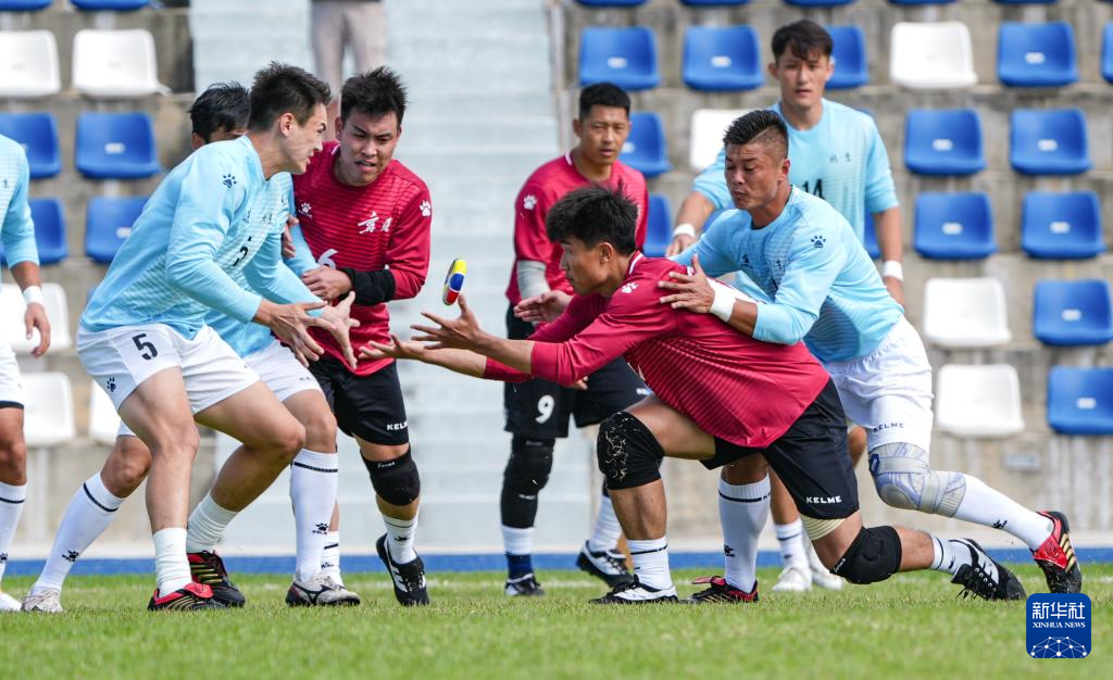 11月25日,廣西隊(duì)選手與河北隊(duì)選手在比賽中爭(zhēng)搶花炮。最終,廣西隊(duì)9比3戰(zhàn)勝河北隊(duì)。