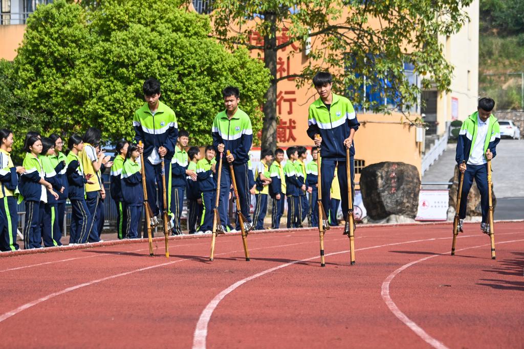 11月6日,廣西玉林市民族中學(xué)的學(xué)生們在進行高腳競速比賽