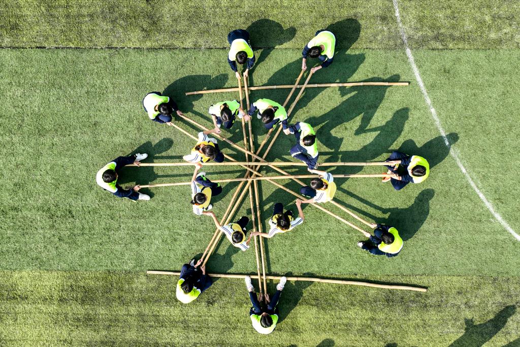 11月6日,廣西玉林市民族中學(xué)的學(xué)生們在跳竹竿舞(無人機照片)
