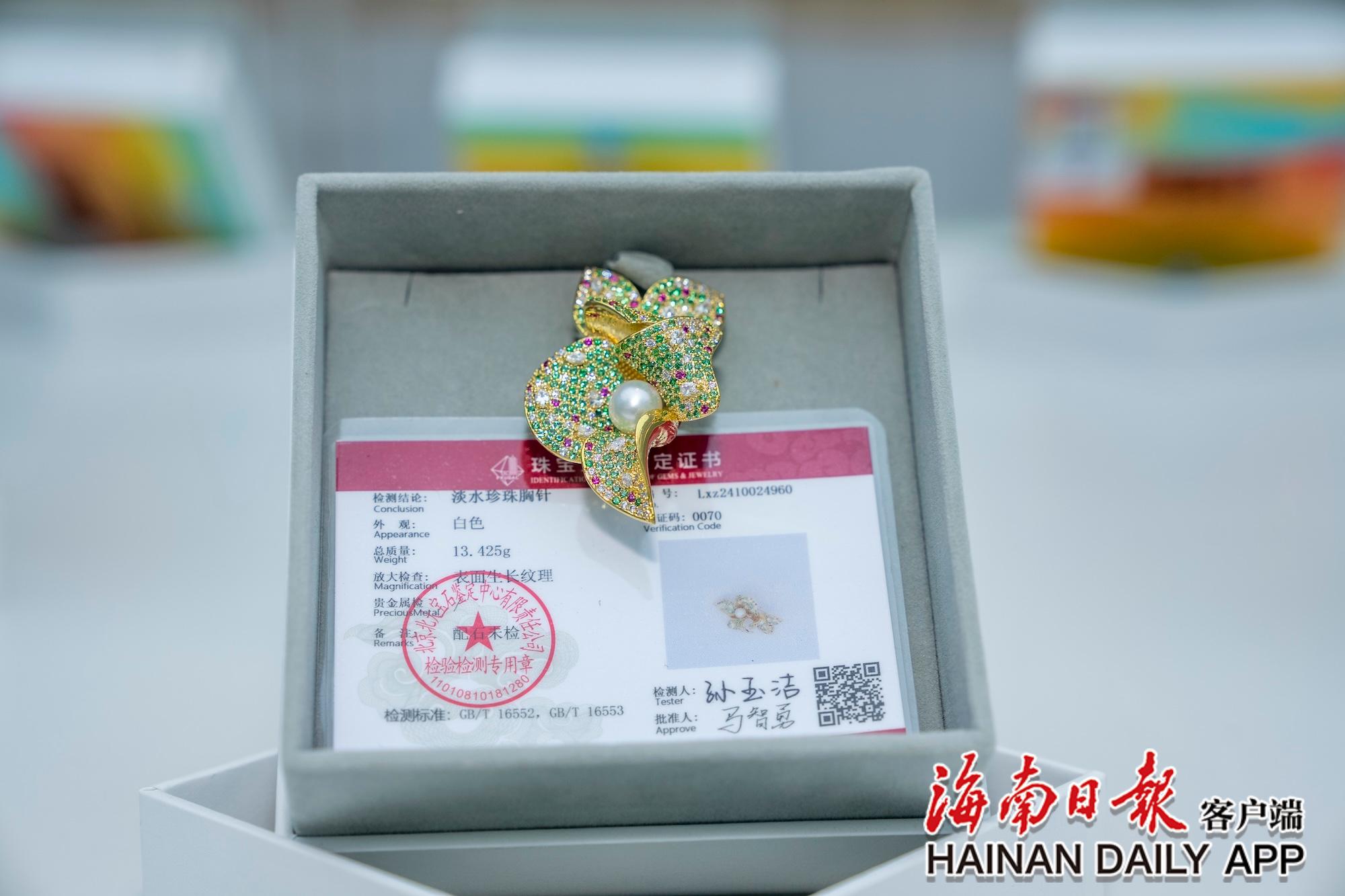 11月8日,三亞灣紅樹林度假世界的運動會官方特許商品展示廳內(nèi)的淡水珍珠胸針。海南日報全媒體記者 李天平 攝