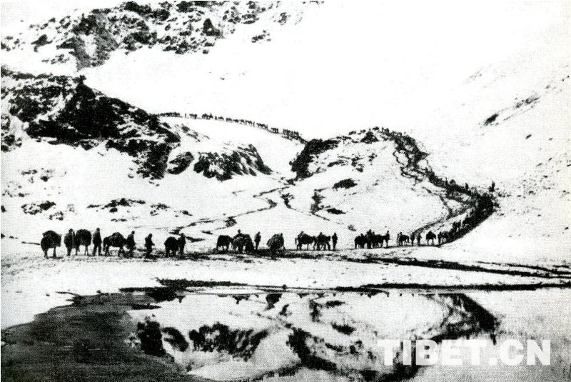圖為1951年10月,進(jìn)藏部隊(duì)越過海拔六千余米的冷拉大雪山向拉薩前進(jìn)