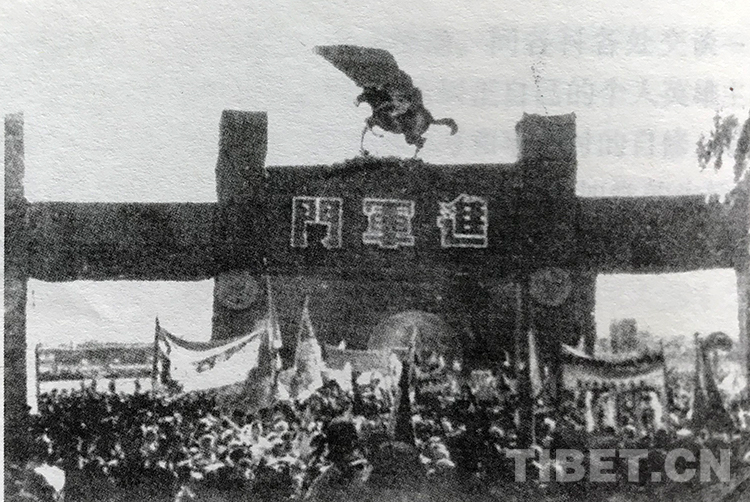 下午四點,部隊開始進(jìn)入進(jìn)軍西藏誓師大會會場。進(jìn)軍門上方,一旗、一人、一馬,士氣高昂、整裝待發(fā);進(jìn)軍門前,打著紅綠標(biāo)語的各界人士和群眾高呼著:“進(jìn)軍西藏,你們走到哪里,我們支持到哪里!”整整兩萬人的部隊和群眾陸續(xù)通過特意布置的進(jìn)軍門進(jìn)入布滿紅色標(biāo)語的三蘇公園。