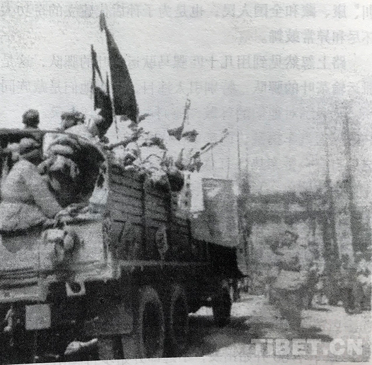 魏克在日記中寫道:“滿載著進(jìn)軍英雄們的車隊,被沿途歡送的人群包圍起來了,許多青年男女跑上來,在汽車上貼滿了紅綠標(biāo)語,送上一碗碗茶水,將一把把香煙撒在車廂上,鮮花、紙花、小旗子插滿了車的四周。‘祝你們旗開得勝,馬到成功’和‘迅速解放西藏人民’的口號聲此起彼伏、響徹云霄。汽車慢慢地從一個個彩門下通過,被歡呼的群眾送了一程又一程?!?/p>