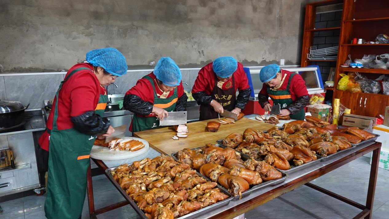 食材加工間里,村民蔣淑芳正在仔細(xì)刷豬蹄,她是團(tuán)隊里的老人了。這份工作,她很知足,工資每月多的時候能掙四五千。負(fù)責(zé)切菜的漫玉也是南屯村人,今年55歲,她原本在城里的餐廳打工,去年底為了照顧生病的哥哥,辭工回了家,也加入了鞏大廚的團(tuán)隊。