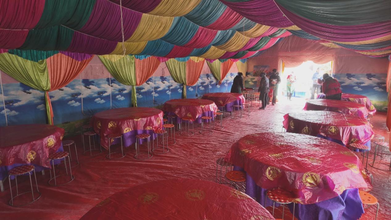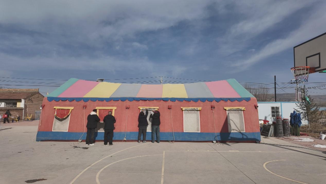 大家一起動手,不到半小時,一個大約一百平方米的移動帳篷宴會廳平地而起,配套的桌椅、桌布、取暖設(shè)備和照明電燈等一樣不少。鍋灶、煤氣爐、蒸箱一字排開,就在帳篷門口,真正“明廚亮灶”。備好了大件,大家開始洗青菜、擇菜,這些當(dāng)天現(xiàn)弄才新鮮。