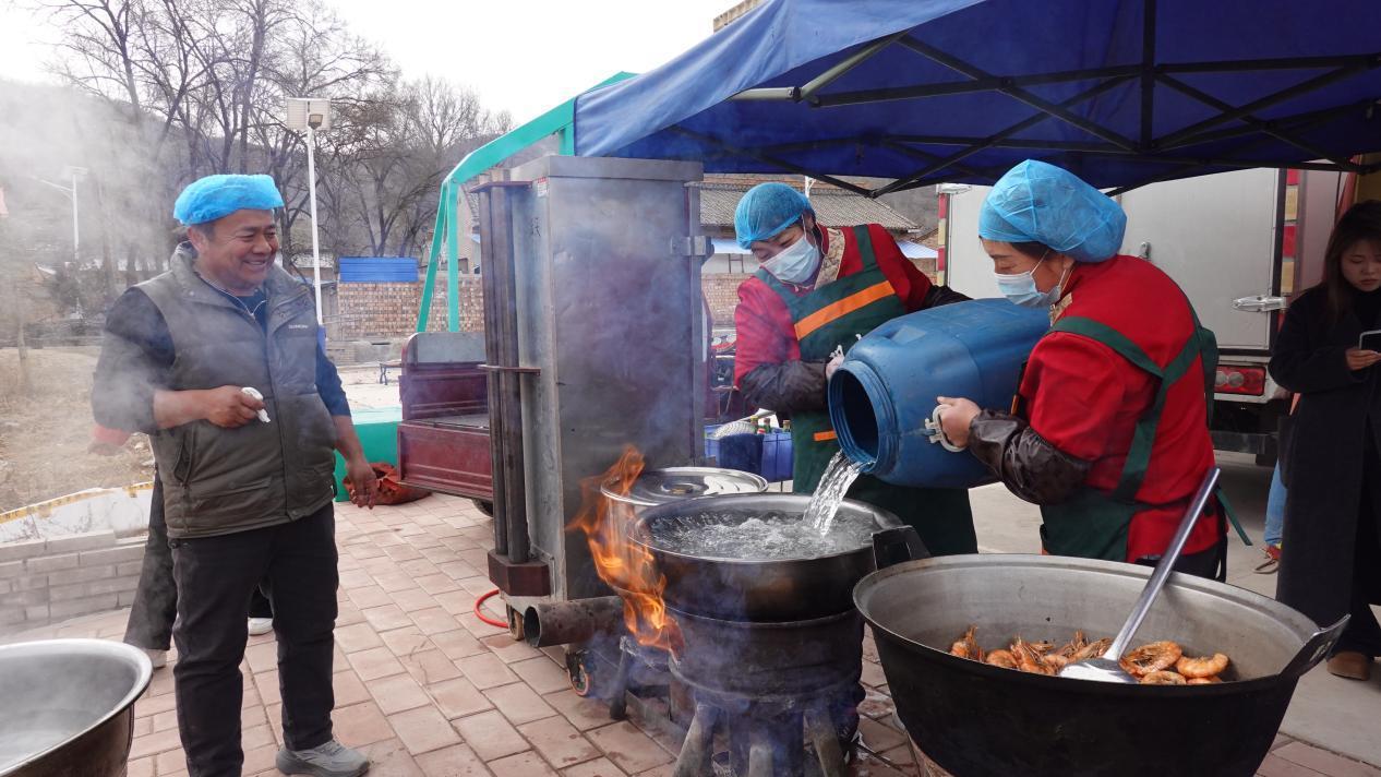 早上八點,天剛麻麻亮,食材加工間里已經(jīng)熱氣騰騰。五個幫廚,加上鞏耀軍兩口子,七個人的團(tuán)隊到齊了。不用吩咐,打水的、生火的、擦灶臺的,各干各的,利利索索。鞏耀軍說,大家伙跟著他這么多年都習(xí)慣了,該干什么都知道,不用他吩咐。