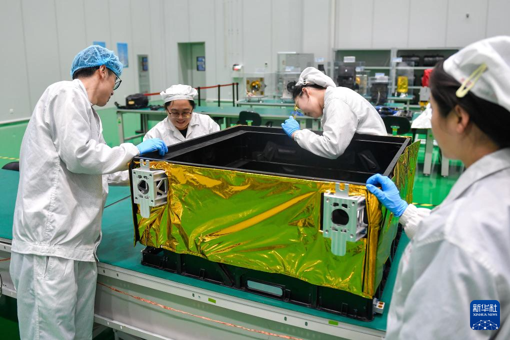 在吉林省長春市,長光衛(wèi)星技術(shù)股份有限公司科研人員將制作完成的多層隔熱組件包覆在衛(wèi)星外殼部件上(4月2日攝)。