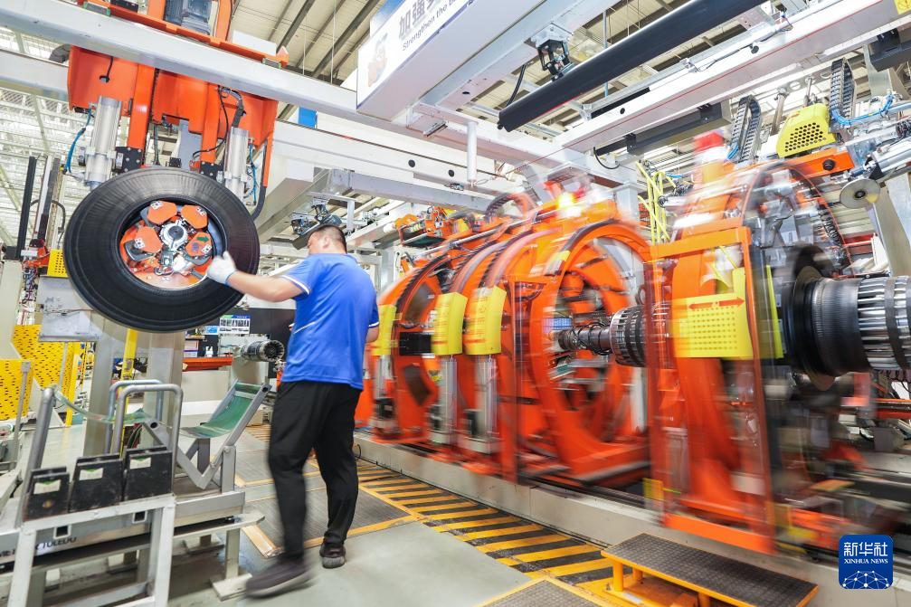 9月3日,在位于長春汽車經(jīng)濟(jì)技術(shù)開發(fā)區(qū)的吉林玲瓏輪胎有限公司生產(chǎn)車間內(nèi),工人使用成型機(jī)加工輪胎產(chǎn)品。