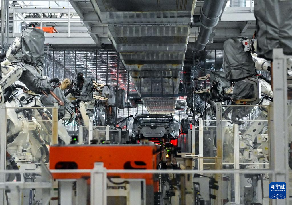 8月5日,在長春市一汽紅旗制造中心繁榮廠區(qū)的焊裝車間內(nèi),焊裝機(jī)器人在生產(chǎn)線上焊接車身。