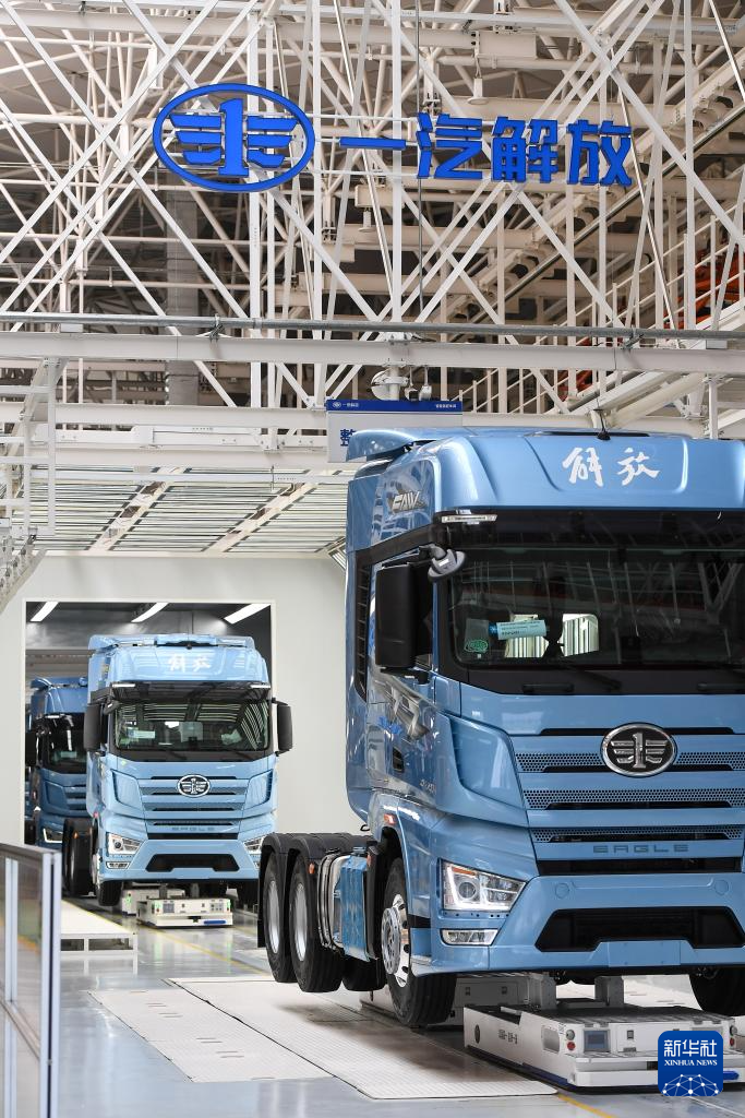 8月9日,在位于吉林長春的一汽解放汽車有限公司J7智能工廠內(nèi),AGV搬運(yùn)機(jī)器人搬運(yùn)車輛行進(jìn)在生產(chǎn)線上。