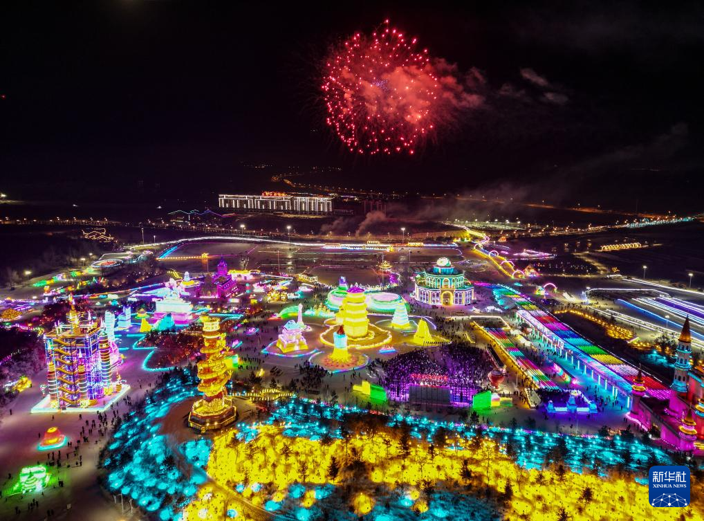 2月24日,游客在長春冰雪新天地欣賞冰燈和煙花表演(無人機(jī)照片)。