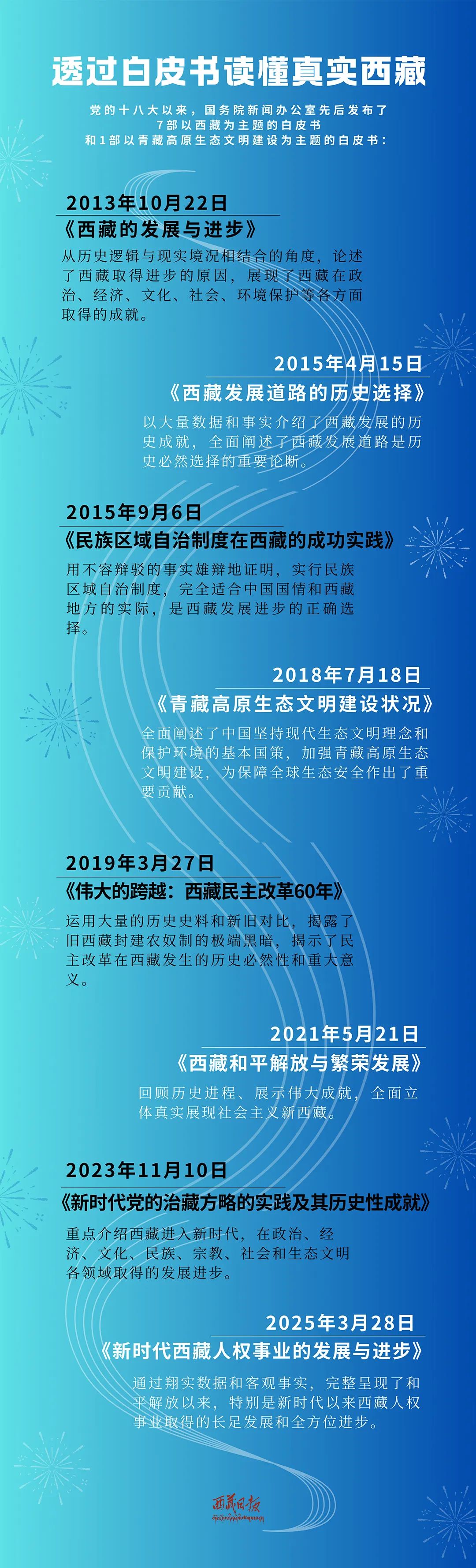例如,2015年發(fā)布《西藏發(fā)展道路的歷史選擇》《民族區(qū)域自治制度在西藏的成功實踐》兩部白皮書,該年是西藏自治區(qū)成立50周年;2019年發(fā)布《偉大的跨越:西藏民主改革60年》白皮書,該年是西藏民主改革60周年;2021年發(fā)布《西藏和平解放與繁榮發(fā)展》白皮書,該年是西藏和平解放70周年;2025年發(fā)布《新時代西藏人權事業(yè)的發(fā)展與進步》白皮書,該年是西藏自治區(qū)成立60周年。