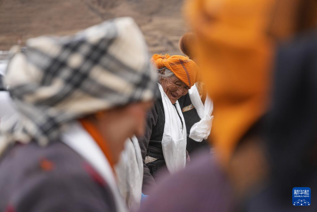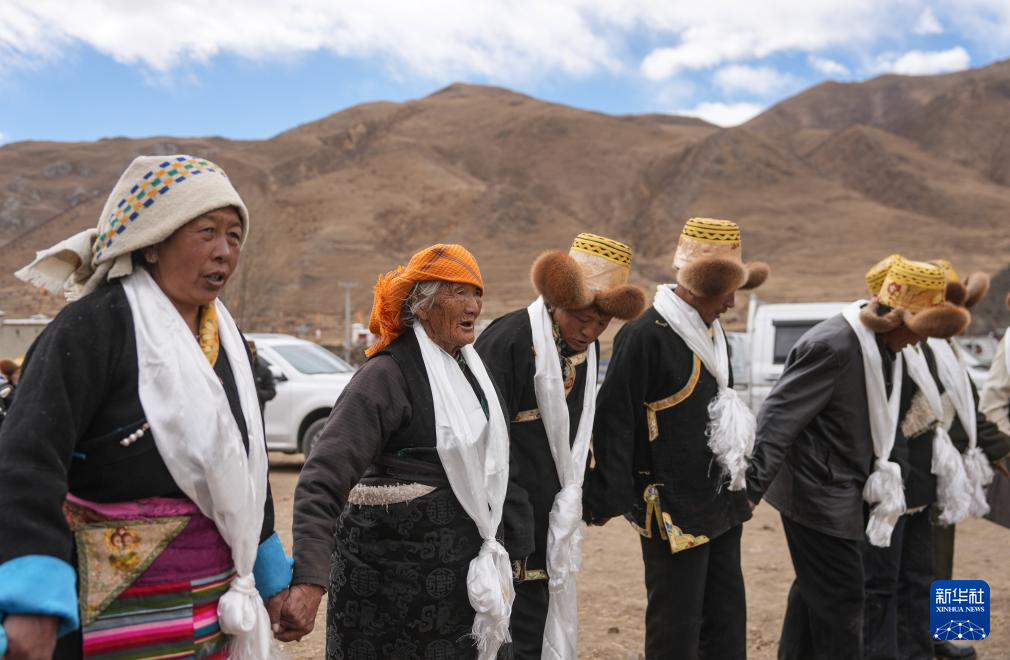 在春耕大典上,白姆老人(左二)和鄉(xiāng)親一起跳鍋莊(3月16日攝)。新華社記者 晉美多吉 攝