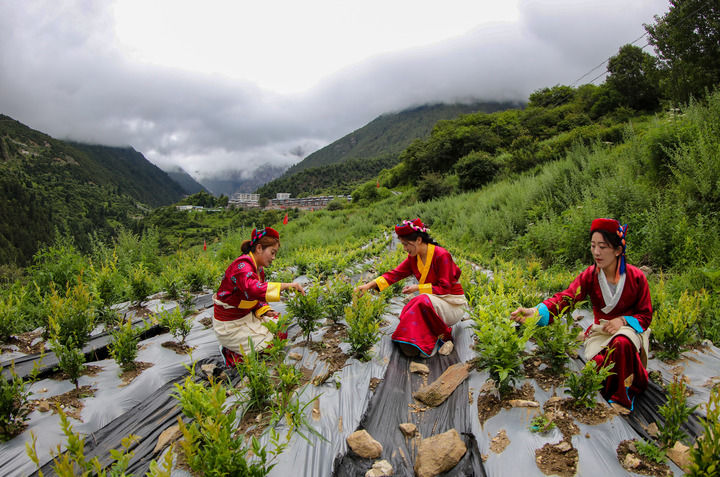 2022年,安徽省援藏工作隊(duì)在勒布溝引入莓茶種植,試驗(yàn)性種植30畝。這是當(dāng)?shù)卮迕裨诓烧瑁?023年7月28日攝)。新華社記者 旦增尼瑪曲珠 攝