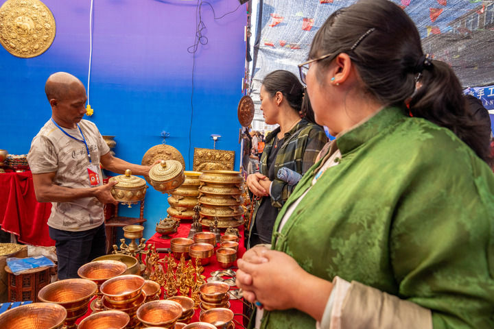 來自尼泊爾的商人阿曼在西藏昌都市首屆尼泊爾進(jìn)口商品展銷會(huì)上向顧客展示商品(2024年8月19日攝)。新華社記者 旦增尼瑪曲珠 攝