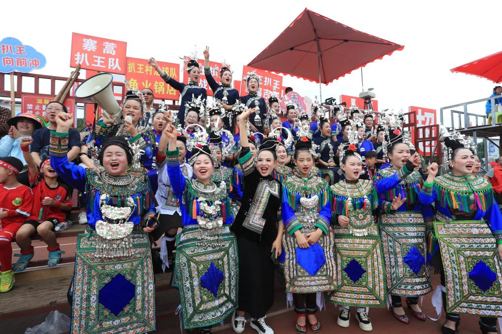 2024年5月4日,在貴州省黔東南苗族侗族自治州榕江縣“村超”球場,當地群眾身著盛裝為本村球隊加油鼓勁。新華社發(fā)(楊成利 攝)