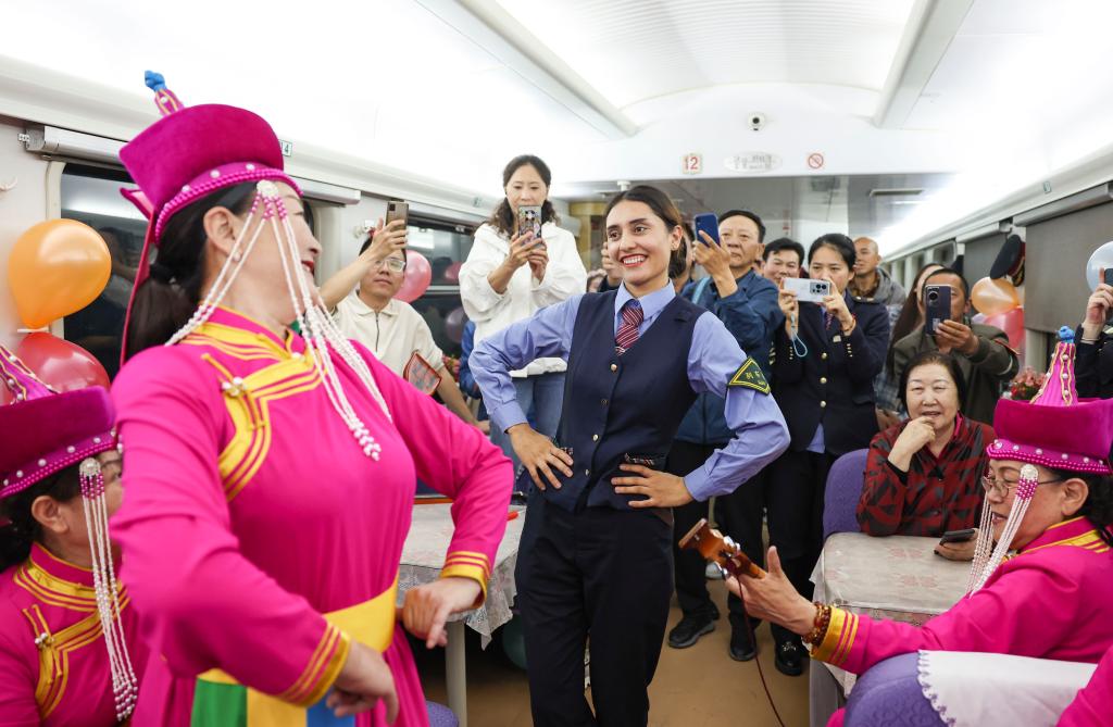 在由喀什開往成都西的列車上,塔吉克族列車長艾爾開牙·多力開與民間藝人一起跳舞(2024年4月19日攝)?;貞浫肼毥洑v,艾爾開牙·多力開說:“這是一次幸福的機遇?!?019年,為助力脫貧攻堅,鐵路部門在新疆喀什、和田等地招錄1000多名應屆畢業(yè)生。剛走出大學校門的艾爾開牙·多力開抱著試一試的心態(tài),帶著對遠方的憧憬,與鐵路結緣。在擔任列車員的四年時間里,艾爾開牙·多力開一步步成長,工作出勤、作業(yè)規(guī)范等考核都名列前茅。2023年下半年,她以優(yōu)異成績通過系列綜合測評,成為我國首位塔吉克族列車長。新華社記者 胡虎虎 攝