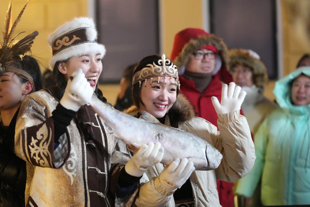 2024年1月6日,戴著魚皮頭飾的赫哲族姑娘(右)與黑龍江省饒河縣文旅推薦官在哈爾濱中央大街上推介家鄉(xiāng)特產魚品,讓天南海北的游客感受到濃郁的赫哲民族風情。新華社記者 王建威 攝