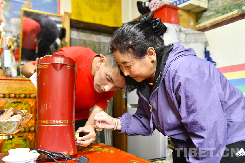 圖為卓嘎與兒子羅布次仁一起仔細研究這一臺全自動酥油茶壺的使用 攝影:趙振宇