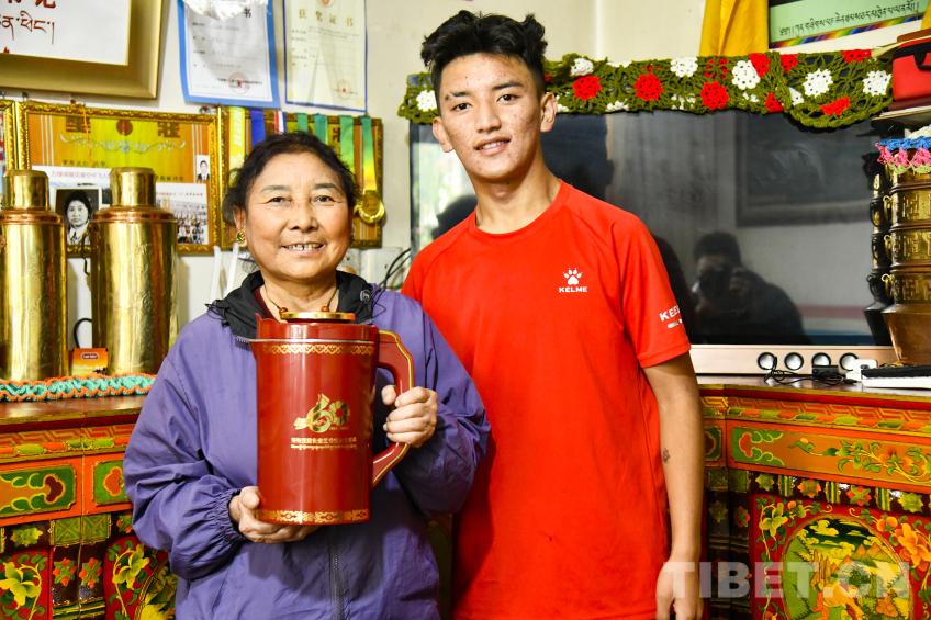 圖為羅布次仁為母親卓嘎倒上第一杯酥油茶,這對茶杯是西藏自治區(qū)成立50周年中央代表團贈送的禮物 攝影:趙振宇