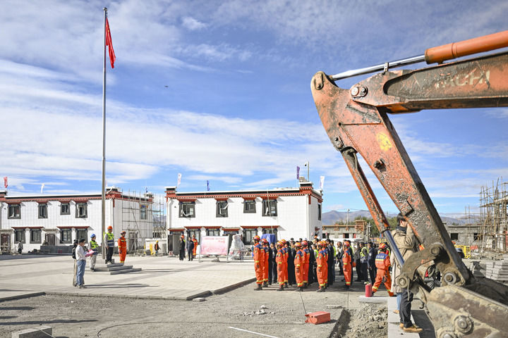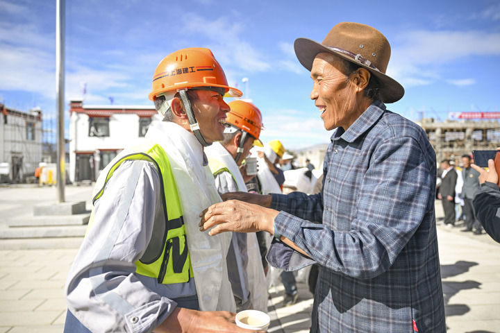 機器的轟鳴聲與悠揚的藏民族歌曲交織在一起,村民們依次向援建者獻上潔白的哈達、斟滿飄香的酥油茶,還有村民用大拇指蘸著白色的糌粑在他們身上點個指印,宛如一個個真誠的“點贊”,場景溫暖感人。