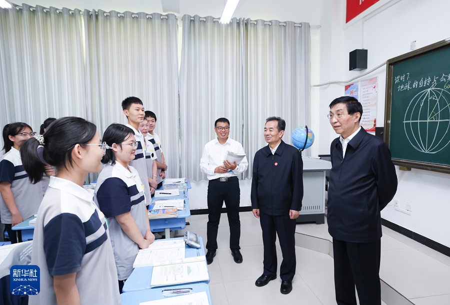 9月25日下午,受習近平總書記囑托,中共中央政治局常委、全國政協主席、中央代表團團長王滬寧帶領中央代表團部分成員在巴音郭楞蒙古自治州庫爾勒市看望慰問當地各族干部群眾。這是王滬寧和中央代表團部分成員在庫爾勒市第二十三中學考察教育援疆情況。新華社記者 姚大偉 攝