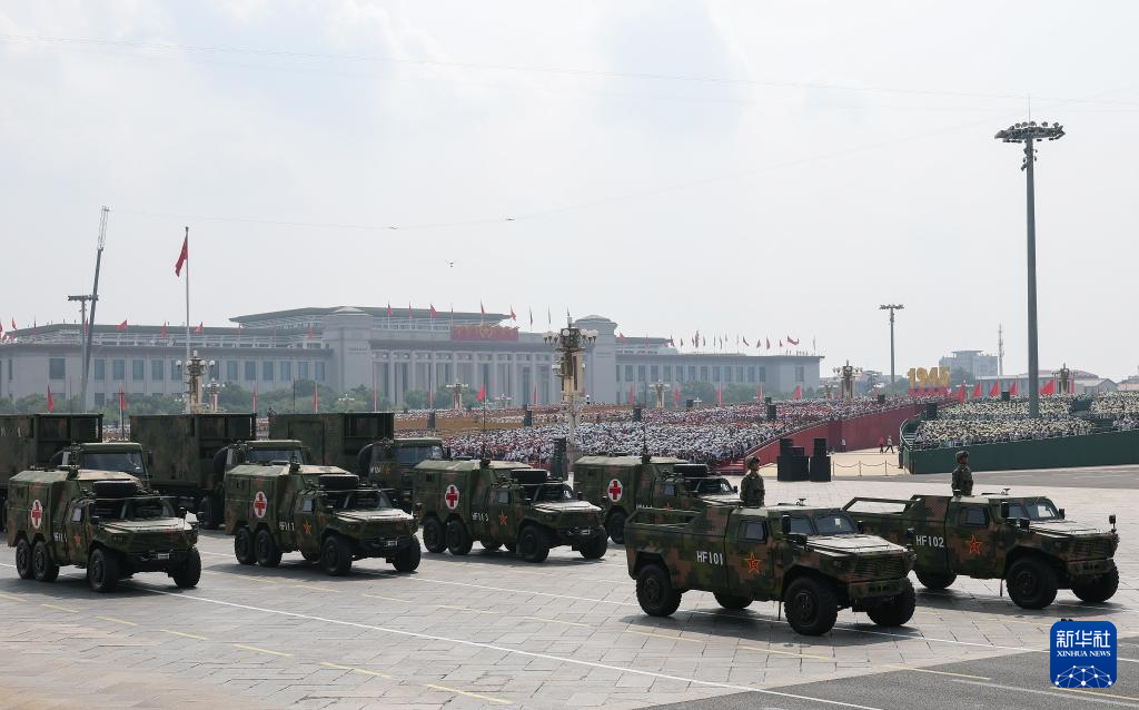 9月3日,紀(jì)念中國人民抗日戰(zhàn)爭暨世界反法西斯戰(zhàn)爭勝利80周年大會(huì)在北京隆重舉行。這是后勤保障方隊(duì)接受檢閱。