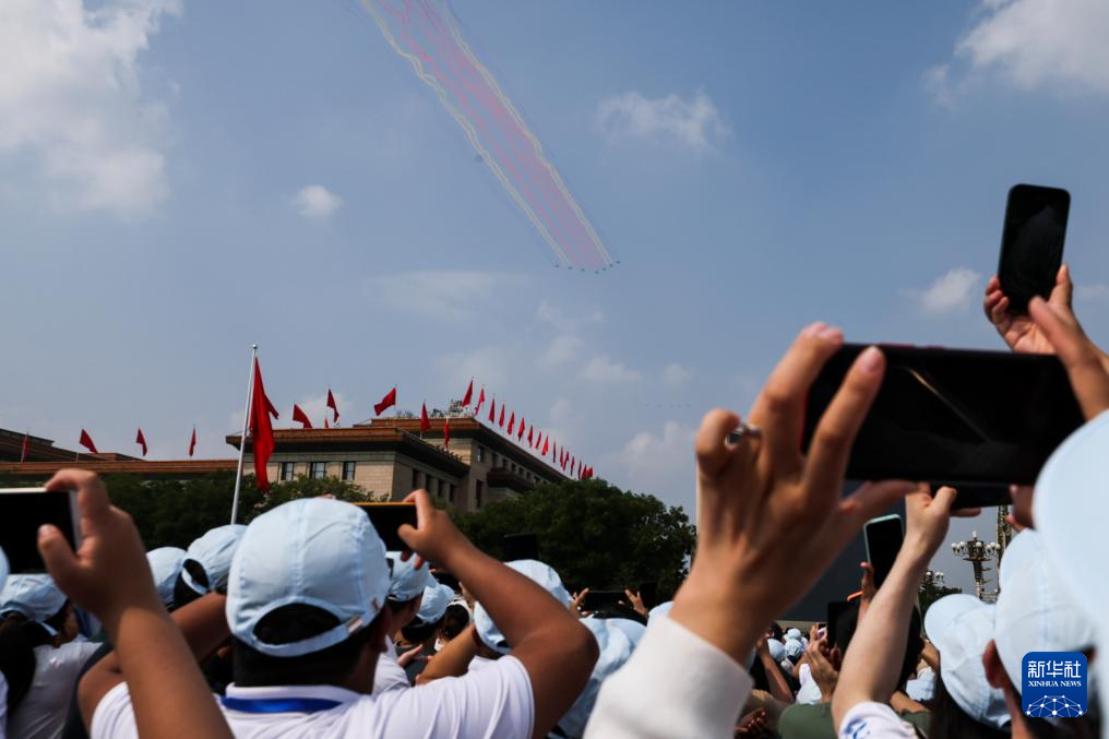 9月3日,紀(jì)念中國人民抗日戰(zhàn)爭暨世界反法西斯戰(zhàn)爭勝利80周年大會(huì)在北京隆重舉行。這是觀眾拍攝教練機(jī)梯隊(duì)接受檢閱。