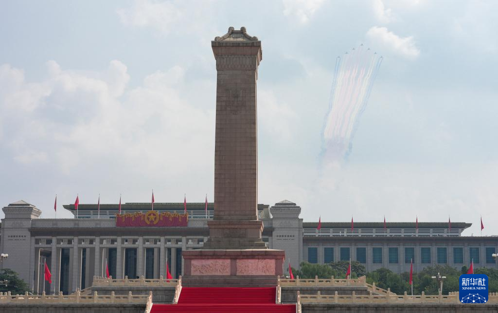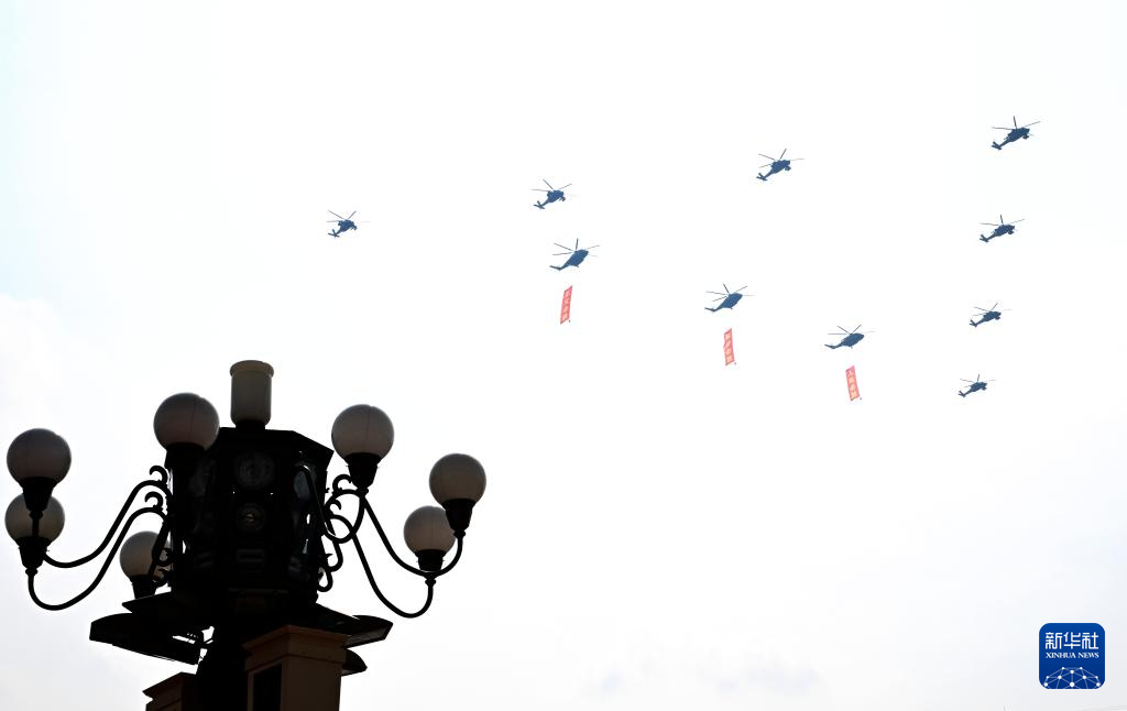 9月3日,紀(jì)念中國人民抗日戰(zhàn)爭暨世界反法西斯戰(zhàn)爭勝利80周年大會(huì)在北京隆重舉行。這是空中護(hù)旗梯隊(duì)飛過天安門廣場上空。
