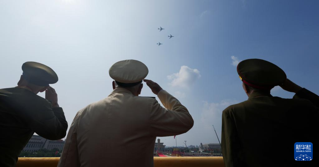 9月3日,紀(jì)念中國(guó)人民抗日戰(zhàn)爭(zhēng)暨世界反法西斯戰(zhàn)爭(zhēng)勝利80周年大會(huì)在北京隆重舉行。這是轟炸機(jī)梯隊(duì)飛過(guò)天安門(mén)廣場(chǎng)上空時(shí)嘉賓敬禮。