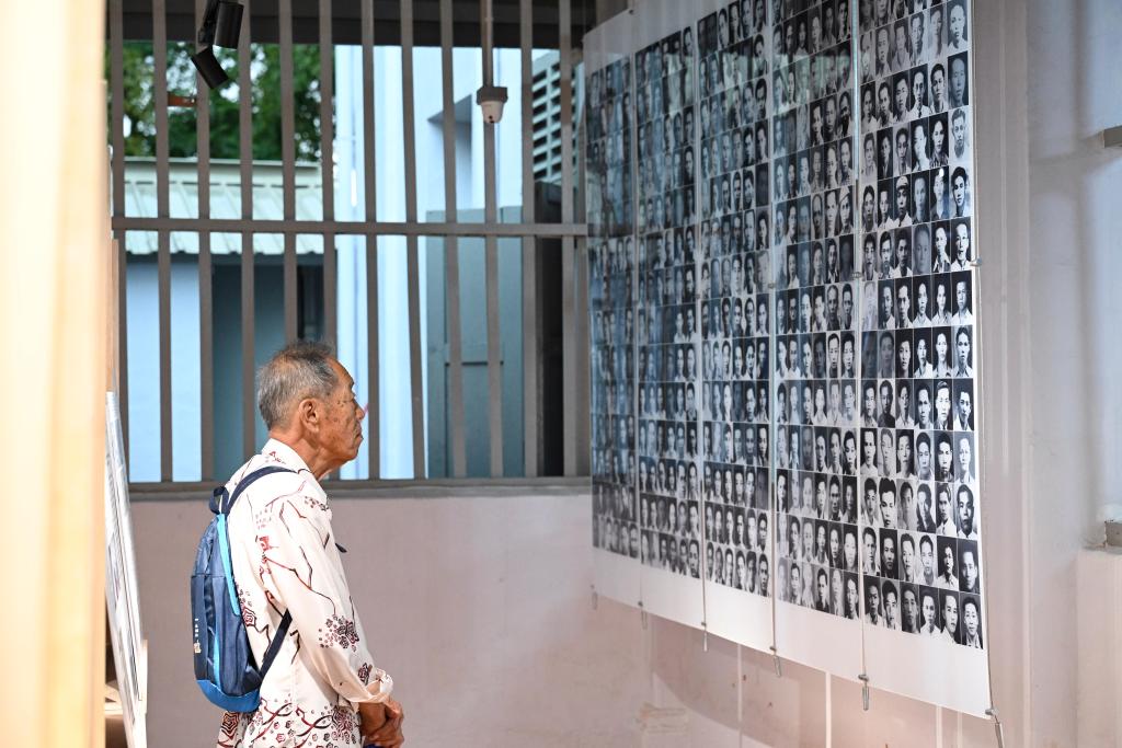 2025年8月14日,在剛揭幕的馬來西亞吉隆坡南僑機工紀念館內,一名老人觀看南僑機工照片墻。 新華社記者 程一恒 攝