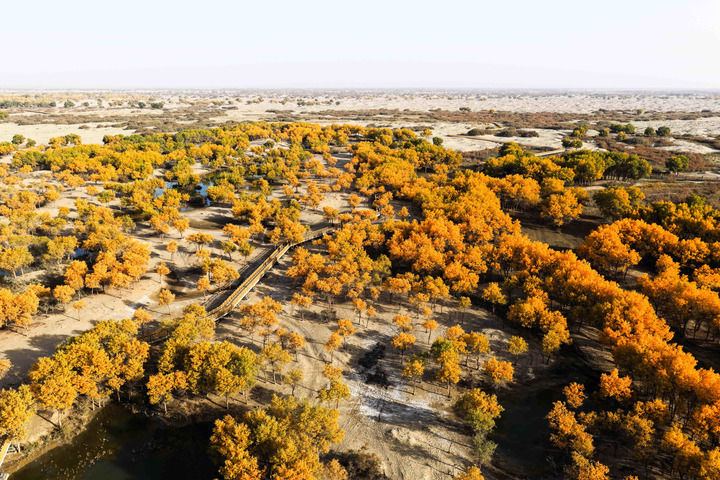 這是2025年10月19日拍攝的新疆和田地區(qū)洛浦縣洛濱胡楊林景區(qū)風(fēng)光(無人機照片)。新華社記者 辛悅衛(wèi) 攝