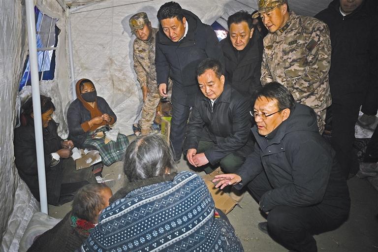 每到一處,王君正都向群眾轉(zhuǎn)達(dá)習(xí)近平總書記和黨中央、中央領(lǐng)導(dǎo)同志的關(guān)心關(guān)懷,告訴群眾相信有習(xí)近平總書記的關(guān)心關(guān)懷,我們就沒(méi)有克服不了的困難。當(dāng)受災(zāi)群眾聽(tīng)到習(xí)近平總書記和中央領(lǐng)導(dǎo)同志的關(guān)心關(guān)懷,大家十分激動(dòng),許多群眾流下了感動(dòng)的淚水,對(duì)抗震救災(zāi)、重建家園燃起了信心?!拔覀兙褪菗?dān)心老人孩子晚上受凍感冒?!碑?dāng)聽(tīng)到災(zāi)區(qū)群眾的擔(dān)心時(shí),王君正說(shuō):“你們的擔(dān)心正是我們的擔(dān)心?!碧鞛?zāi)無(wú)情、人有情。在安置點(diǎn)上,王君正鼓勵(lì)受災(zāi)群眾堅(jiān)定信心,黨和政府一定會(huì)全力以赴開(kāi)展抗震救災(zāi),大家要團(tuán)結(jié)一心、互幫互助,克服暫時(shí)的困難,加強(qiáng)統(tǒng)一規(guī)劃、重建新家園,齊心協(xié)力共建社會(huì)主義新農(nóng)村。晚上六點(diǎn)三十分許,海拔4400米的安置點(diǎn)上寒風(fēng)凜冽,看見(jiàn)已有帳篷陸陸續(xù)續(xù)搭建起來(lái),王君正叮囑受災(zāi)群眾趕緊到帳篷里取暖,不要受涼受凍。他要求相關(guān)部門,要深刻認(rèn)識(shí)災(zāi)區(qū)地處高海拔區(qū)域的特殊情況,把受災(zāi)群眾御寒保暖工作擺在更加突出位置,加緊調(diào)集棉帳篷、棉衣、棉被、烤火爐等物資,加快帳篷安裝進(jìn)度,確保受災(zāi)群眾吃上熱飯、喝上熱水、住上帳篷、溫暖過(guò)夜、感受親情。要嚴(yán)防發(fā)生次生災(zāi)害,全面排查房屋受損情況,對(duì)嚴(yán)重受損的建筑嚴(yán)格管控,強(qiáng)化巡查值守,做好安全防范工作,嚴(yán)防火災(zāi),抓好衛(wèi)生防疫,配備預(yù)防流感等藥物,加強(qiáng)食品和飲用水衛(wèi)生監(jiān)管,堅(jiān)決維護(hù)災(zāi)區(qū)社會(huì)穩(wěn)定。要充分發(fā)揮基層黨組織戰(zhàn)斗堡壘作用和黨員先鋒模范作用,落實(shí)落細(xì)黨中央和自治區(qū)抗震救災(zāi)各項(xiàng)安排部署,主動(dòng)同受災(zāi)群眾吃住在一起,用心用情解決困難,引導(dǎo)受災(zāi)群眾開(kāi)展自救、互幫互助,讓黨旗在抗震救災(zāi)一線高高飄揚(yáng)。黨政軍警民要協(xié)調(diào)聯(lián)動(dòng),解放軍、武警、消防、邊檢和地方各救援力量要統(tǒng)一指揮、統(tǒng)一調(diào)度、加強(qiáng)協(xié)同、密切合作,齊心協(xié)力抓好抗震救災(zāi)工作。
