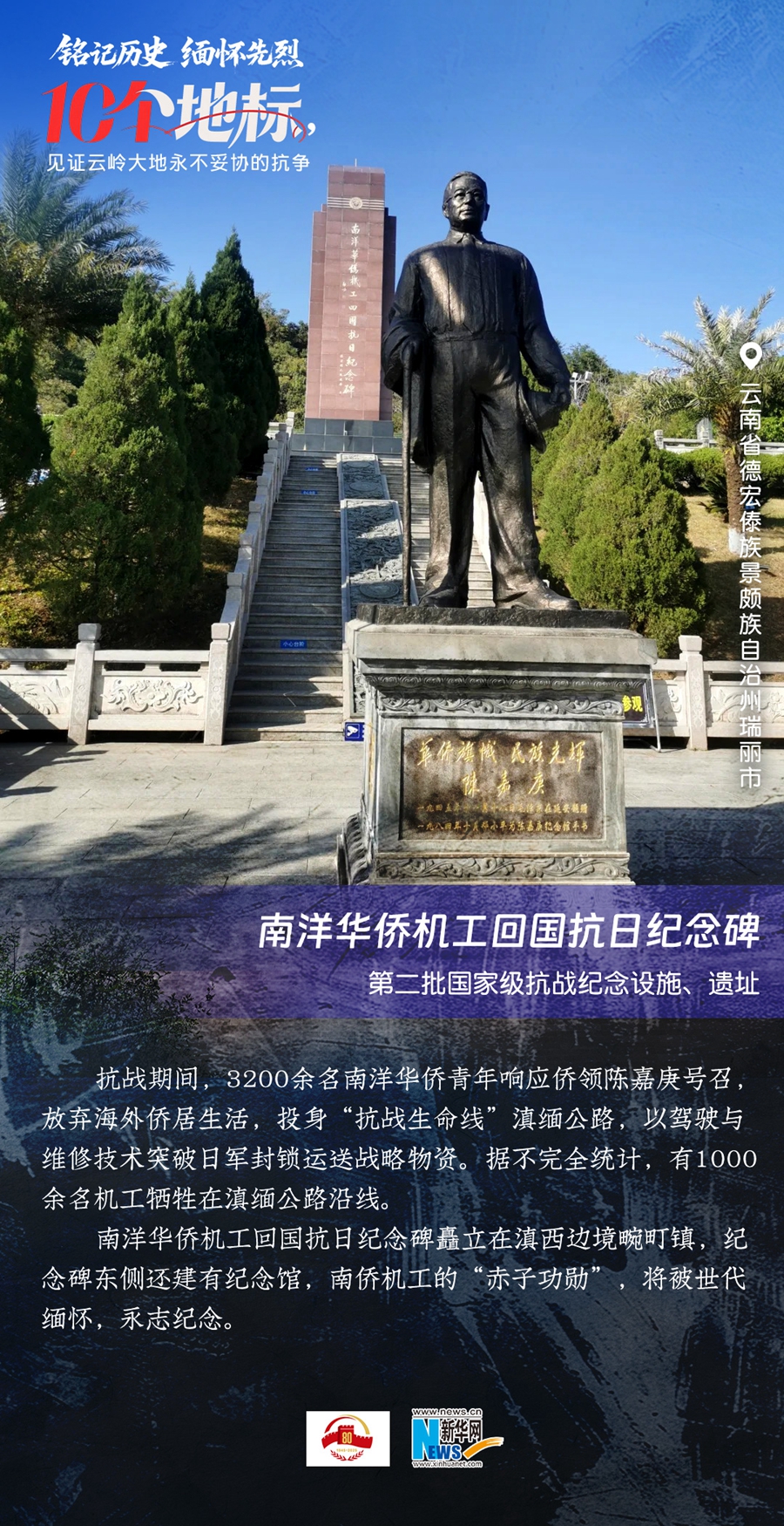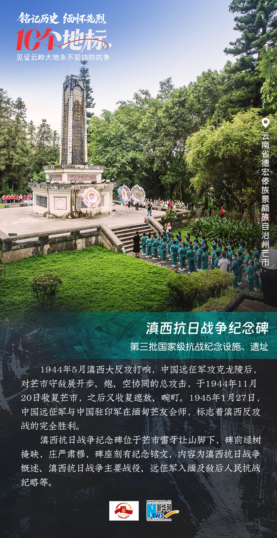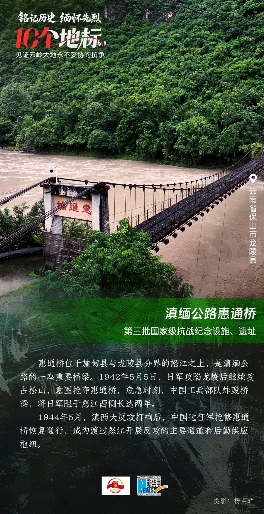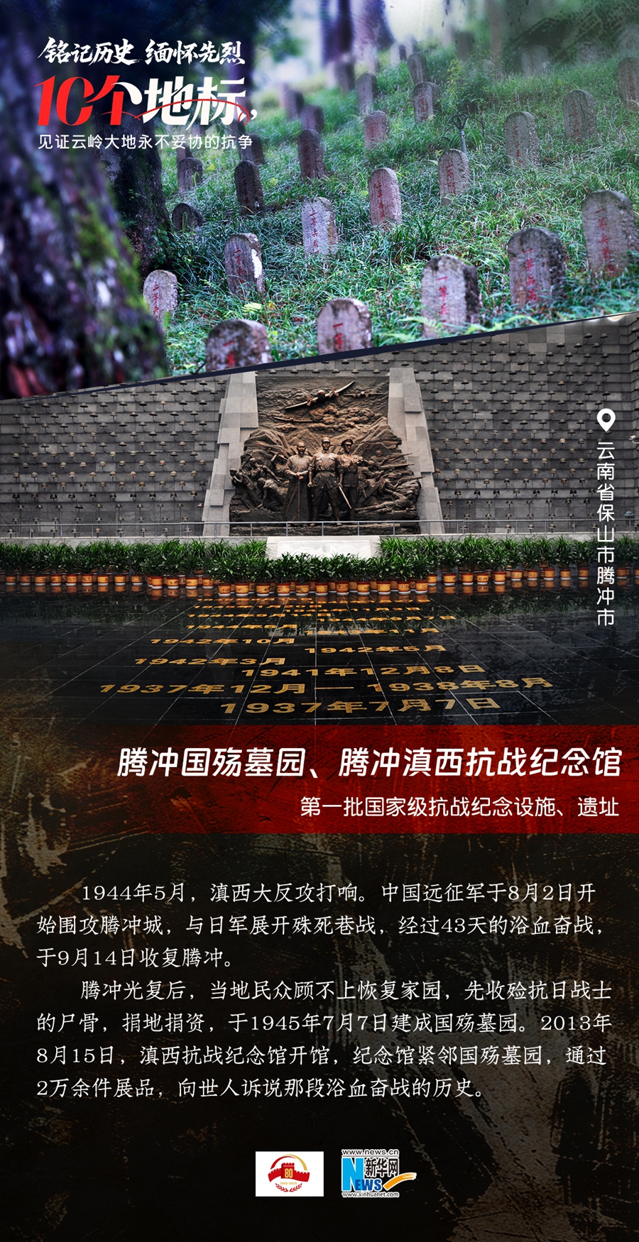 ??80年過去,曾經(jīng)的戰(zhàn)場(chǎng)硝煙雖散,但英氣永存。在國(guó)務(wù)院公布的前三批國(guó)家級(jí)抗戰(zhàn)紀(jì)念設(shè)施、遺址名錄中,云南省共有10個(gè),分別為騰沖國(guó)殤墓園、騰沖滇西抗戰(zhàn)紀(jì)念館,龍陵抗日戰(zhàn)爭(zhēng)紀(jì)念館,國(guó)立西南聯(lián)合大學(xué)舊址,抗戰(zhàn)勝利紀(jì)念堂,松山戰(zhàn)役舊址,南洋華僑機(jī)工回國(guó)抗日紀(jì)念碑,怒江駝峰航線紀(jì)念館,施甸縣抗日江防遺跡群,滇緬公路惠通橋,滇西抗日戰(zhàn)爭(zhēng)紀(jì)念碑。它們承載著國(guó)人共同的歷史記憶與民族情感,也為我們學(xué)習(xí)和傳承抗戰(zhàn)精神提供了現(xiàn)實(shí)條件。