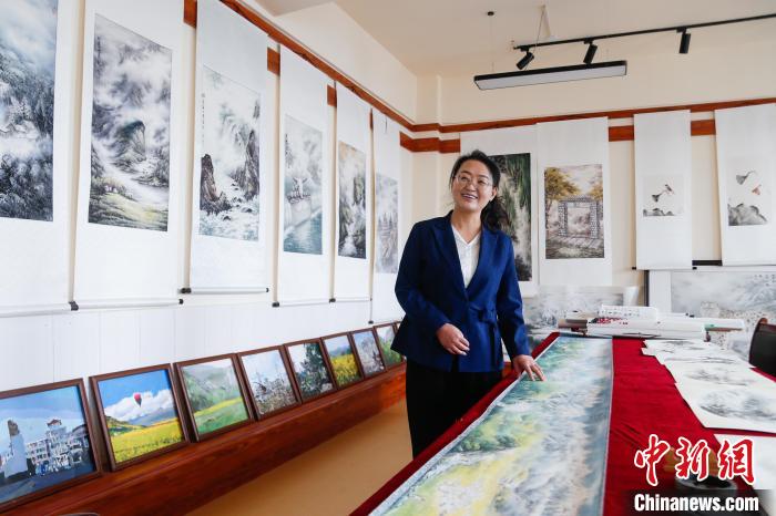 這幅彩墨山水圖出自全國人大代表、青海省海北藏族自治州門源回族自治縣第二寄宿制初級中學(xué)的美術(shù)老師郭金萍之手。