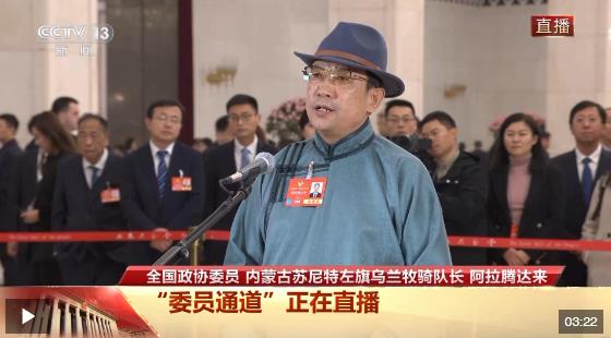 今天(3月10日),全國政協(xié)十四屆三次會議第三場“委員通道”在人民大會堂舉行,全國政協(xié)委員、內(nèi)蒙古蘇尼特左旗烏蘭牧騎隊長阿拉騰達(dá)來接受了記者采訪。