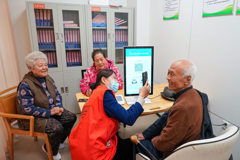 2025年10月23日,老人在山東省淄博市張店區(qū)馬尚街道金石社區(qū)日間護(hù)理中心測量健康數(shù)據(jù)。新華社記者 朱崢 攝