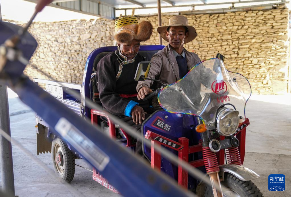 白瑪扎西(左)坐在女婿新買的電動(dòng)三輪摩托車上(3月26日攝)。